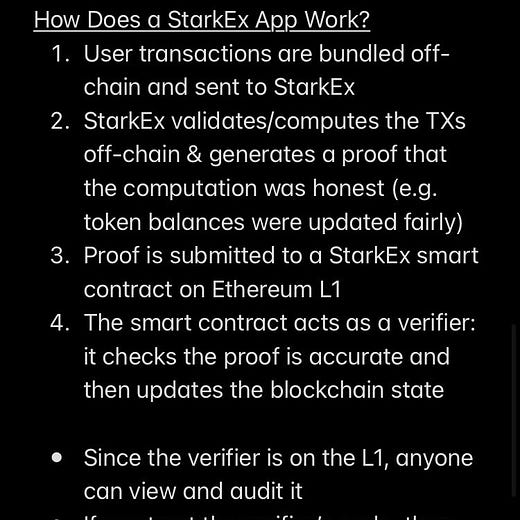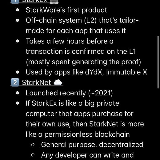 StarkNet: a more recent product that acts like a general-purpose blockchain. Any developer can create a smart contract and deploy it on StarkNet — it’s not permissioned, like StarkEx. Projects are fully composable with one another, and all transactions are rolled up and settled on Ethereum. I suspect you’ll be hearing a lot about StarkNet soon because its token is scheduled to launch in September 👀.