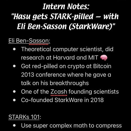 StarkWare is a company building ZK scaling tech that was founded by Eli Ben-Sasson, a true ZK gigachad. Eli co-invented STARKs (an advanced type of ZK proof) and is the founding scientist of Zcash. They have two main products: